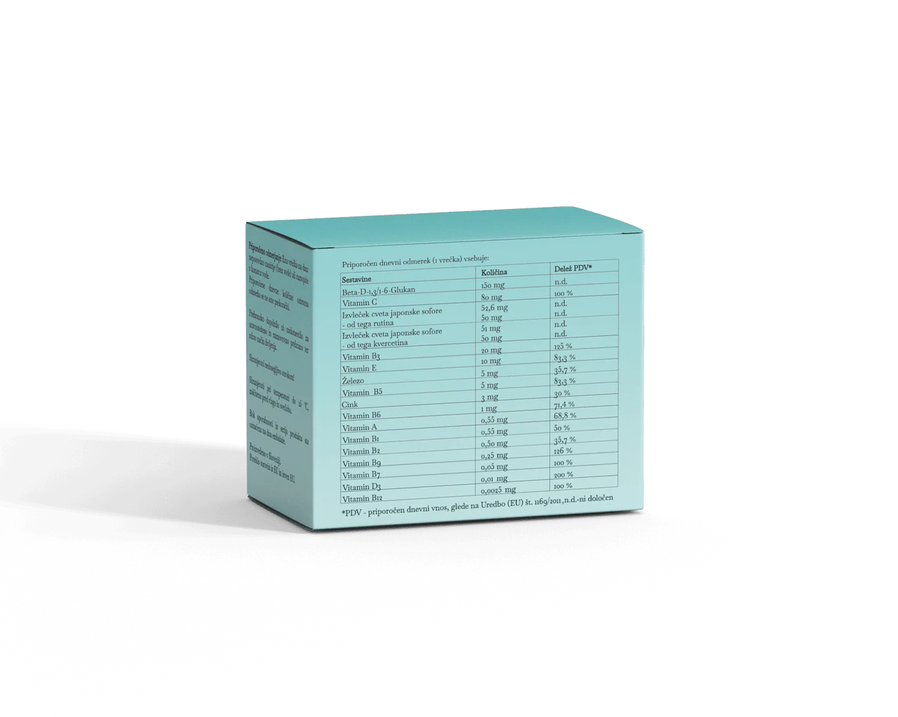 Sestava: Sok plodov manga (Mangifera indica), sok iz acai (Euterpe oleracea) jagod, naravne arome, beta-(1,3/1,6)-D-glukan (iz kvasovk Saccharomyces cerevisiae), vitamin C (L-askorbinska kislina), izvleček cveta japonske sofore (Sophora japonica) standardiziran na najmanj 95% rutina, izvleček cveta japonske sofore (Sophora japonica) standardiziran na najmanj 98% kvercetina, železov bisglicinat, vitamin E (D-alfa-tokoferil acetat), vitamin B3 (niacinamid), cinkov citrat, vitamin B5 (kalcijev D-pantotenat), vitamin D3 (holekalciferol), vitamin A (retinil acetat), vitamin B6 (piridoksin hidroklorid), vitamin B1 (tiamin hidroklorid),vitamin B2 (riboflavin), vitamin B9 (kalcijeva sol L-5-metiltetrahidrafolata), vitamin B7 (biotin), vitamin B12 (metilkobalamin).